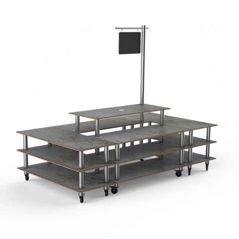 Mogogo Buffet Solutions Modular Market Square, 4-tier, 130" x 71" x 107"H, rectangular, with sign post & chalkboard, grey slate BHP high pressure laminate with bamboo core top, brushed stainless steel casters, knockdown