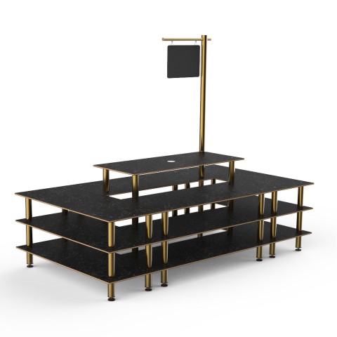 Mogogo Buffet Solutions Modular Market Square, 4-tier, 130" x 71" x 107"H, rectangular, with sign post & chalkboard, Nero Marquina BHP high pressure laminate with bamboo core top, brushed brass legs, knockdown