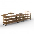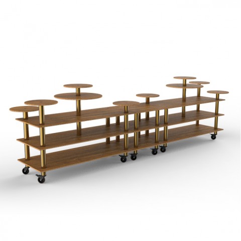 Mogogo Buffet Solutions Modular Display Station, 3-tier, 180-1/2" x 38" x 54"H, rectangular, (10) multi-height shelves, high density bamboo finish, brushed brass casters, knockdown