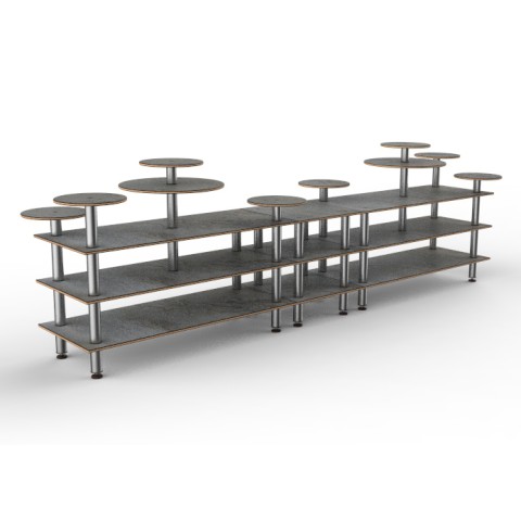 Mogogo Buffet Solutions Modular Display Station, 3-tier, 180-1/2" x 38" x 54"H, rectangular, (10) multi-height shelves, grey slate BHP high pressure laminate with bamboo core top, brushed stainless steel legs, knockdown