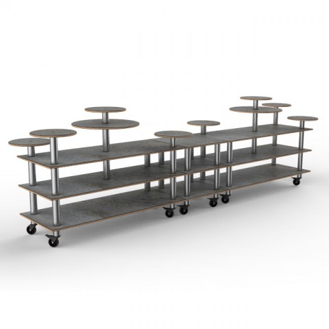 Mogogo Buffet Solutions Modular Display Station, 3-tier, 180-1/2" x 38" x 54"H, rectangular, (10) multi-height shelves, grey slate BHP high pressure laminate with bamboo core top, brushed stainless steel casters, knockdown