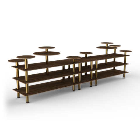 Mogogo Buffet Solutions Modular Display Station, 3-tier, 180-1/2" x 38" x 54"H, rectangular, (10) multi-height shelves, Bengali mango wood BHP high pressure laminate with bamboo core top, brushed brass legs, knockdown