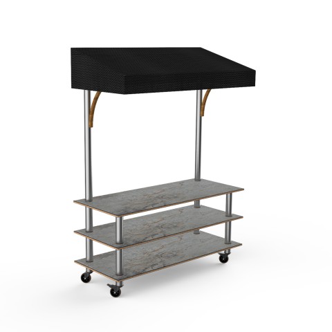 Mogogo Buffet Solutions Modular Classic Canopy Unit, 3-tier, 71" x 29-1/2" x 96"H, rectangular, Nero Marquina BHP high pressure laminate with bamboo core top, black canopy, brushed stainless steel casters, knockdown