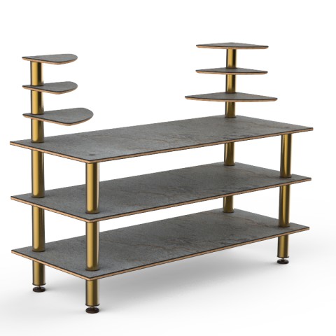 Mogogo Buffet Solutions Modular Classic Multi-Shelf Station, 3-tier, 71" x 29-1/2" x 54"H, rectangular, (6) triangular shelves, grey slate BHP high pressure laminate with bamboo core top, brushed brass legs, knockdown