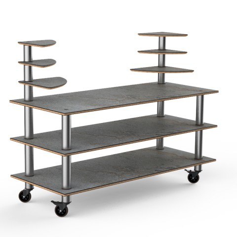 Mogogo Buffet Solutions Modular Classic Multi-Shelf Station, 3-tier, 71" x 29-1/2" x 54"H, rectangular, (6) triangular shelves, grey slate BHP high pressure laminate with bamboo core top, brushed stainless steel casters, knockdown