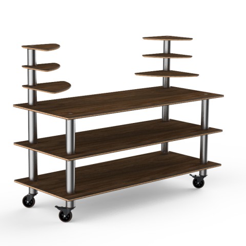 Mogogo Buffet Solutions Modular Classic Multi-Shelf Station, 3-tier, 71" x 29-1/2" x 54"H, rectangular, (6) triangular shelves, Bengali mango wood BHP high pressure laminate with bamboo core top, brushed stainless steel casters, knockdown