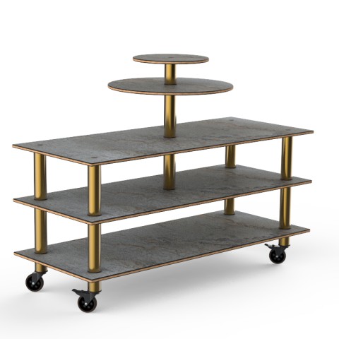 Mogogo Buffet Solutions Modular Multi-Purpose Display, 3-tier, 75" x 29-1/2" x 53-1/2"H, rectangular, (2) tier round shelf, grey slate BHP high pressure laminate with bamboo core top, brushed brass casters, knockdown