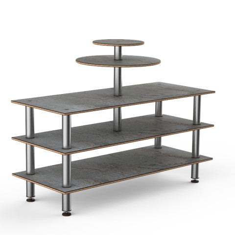Mogogo Buffet Solutions Modular Multi-Purpose Display, 3-tier, 75" x 29-1/2" x 53-1/2"H, rectangular, (2) oval corner shelves, grey slate BHP high pressure laminate with bamboo core top, brushed stainless steel legs, knockdown