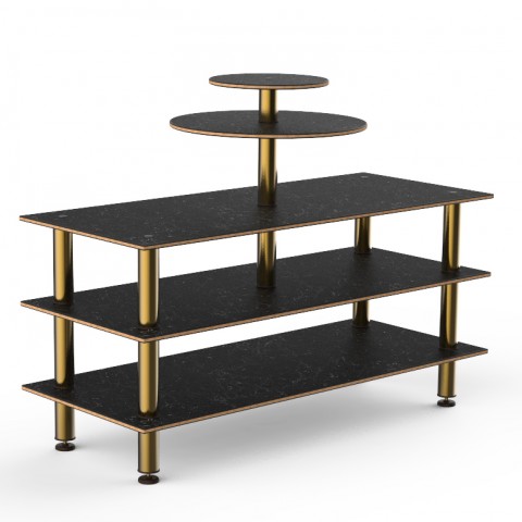 Mogogo Buffet Solutions Modular Multi-Purpose Display, 3-tier, 75" x 29-1/2" x 53-1/2"H, rectangular, (2) oval corner shelves, Nero Marquina marble BHP high pressure laminate with bamboo core top, brushed brass legs, knockdown