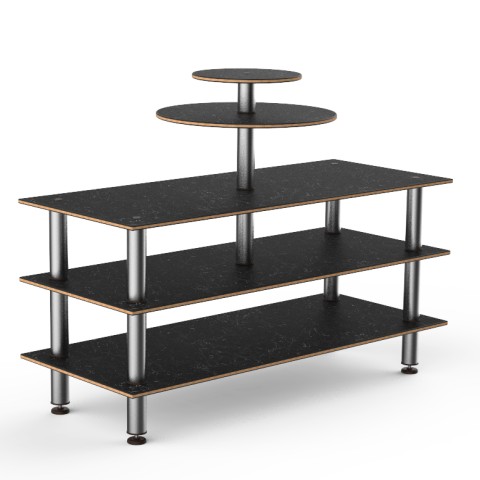 Mogogo Buffet Solutions Modular Multi-Purpose Display, 3-tier, 75" x 29-1/2" x 53-1/2"H, rectangular, (2) tier round shelf, Nero Marquina marble BHP high pressure laminate with bamboo core top, brushed stainless steel legs, knockdown