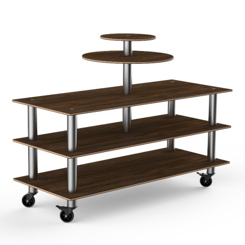 Mogogo Buffet Solutions Modular Multi-Purpose Display, 3-tier, 75" x 29-1/2" x 53-1/2"H, rectangular, (2) tier round shelf, Bengali mango wood BHP high pressure laminate with bamboo core top, brushed stainless steel casters, knockdown