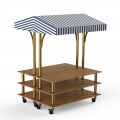 Mogogo Buffet Solutions Modular Back to Back Market Station, 3-tier, 71" x 67" x 95-1/2"H, rectangular, high density bamboo finish, white/blue canopy, brushed brass casters, knockdown