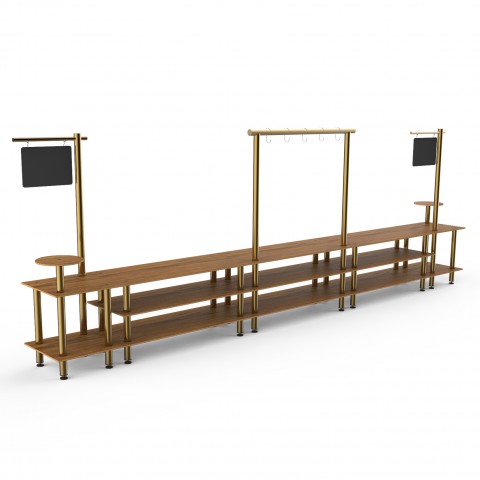 Mogogo Buffet Solutions Modular Fiesta Taco Bar, 3-tier, 558-1/2" x 38" x 96"H, rectangular, (2) round shelves, (2) sign posts with chalkboards, (5) hooks, high density bamboo finish, brushed brass legs, knockdown