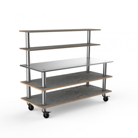 Mogogo Buffet Solutions Modular Back Bar Station, 3-tier, 71" x 29-1/2" x 60-1/2"H, rectangular, stainless steel work surface, (2) back shelves, grey slate BHP high pressure laminate with bamboo core top, brushed stainless steel legs with casters, knockdo