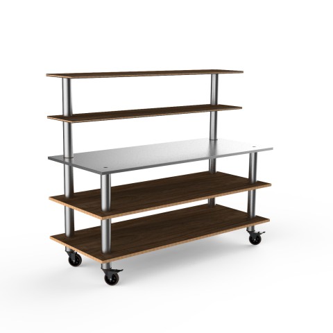 Mogogo Buffet Solutions Modular Back Bar Station, 3-tier, 71" x 29-1/2" x 60-1/2"H, rectangular, stainless steel work surface, (2) back shelves, Bengali mango wood BHP high pressure laminate with bamboo core top, brushed stainless steel legs with casters,