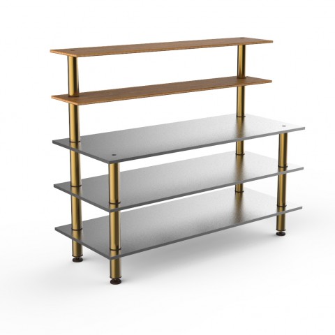 Mogogo Buffet Solutions Modular Pro Back Bar, 5-tier, 71" x 29-1/2" x 60-1/2"H, rectangular, solid stainless steel top, (2) back shelves, high density bamboo finish, stainless steel, brushed brass legs, knocked down
