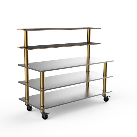 Mogogo Buffet Solutions Modular Pro Back Bar, 5-tier, 71" x 29-1/2" x 60-1/2"H, rectangular, solid stainless steel top, (2) back shelves, Nero Marquina marble BHP high pressure laminate with bamboo core, stainless steel, brushed brass casters, knocked dow