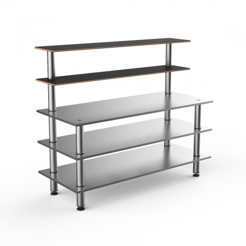 Mogogo Buffet Solutions Modular Pro Back Bar, 5-tier, 71" x 29-1/2" x 60-1/2"H, rectangular, solid stainless steel top, (2) back shelves, Nero Marquina marble BHP high pressure laminate with bamboo core, stainless steel, brushed stainless steel legs, knoc