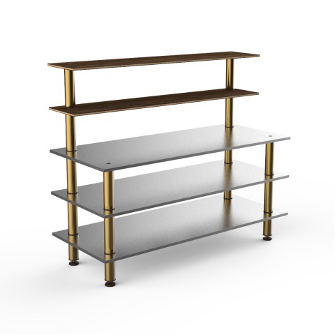 Mogogo Buffet Solutions Modular Pro Back Bar, 5-tier, 71" x 29-1/2" x 60-1/2"H, rectangular, solid stainless steel top, (2) back shelves, Bengali mango wood BHP high pressure laminate with bamboo core, stainless steel, brushed brass legs, knocked down (st