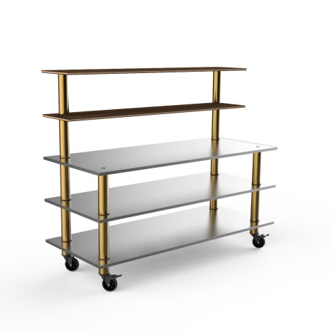 Mogogo Buffet Solutions Modular Pro Back Bar, 5-tier, 71" x 29-1/2" x 60-1/2"H, rectangular, solid stainless steel top, (2) back shelves, Bengali mango wood BHP high pressure laminate with bamboo core, stainless steel, brushed brass casters, knocked down