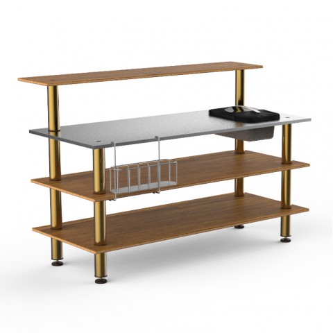 Mogogo Buffet Solutions Modular ProBar Station, 4-tier, 71" x 40" x 47-1/2"H, rectangular, solid stainless steel top, double wall ice bin, slick speed rail, (1) back shelf, high density bamboo finish, brushed brass legs, knockdown