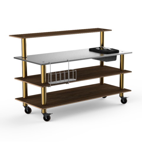 Mogogo Buffet Solutions Modular ProBar Station, 4-tier, 71" x 40" x 47-1/2"H, rectangular, solid stainless steel top, double wall ice bin, slick speed rail, (1) back shelf, Bengali mango wood BHP high pressure laminate with bamboo core top, brushed brass
