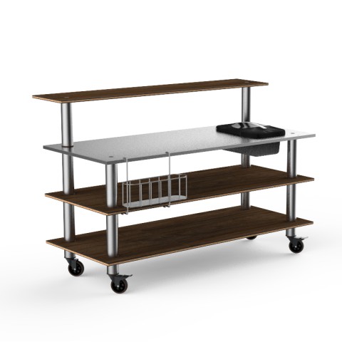 Mogogo Buffet Solutions Modular ProBar Station, 4-tier, 71" x 40" x 47-1/2"H, rectangular, solid stainless steel top, double wall ice bin, slick speed rail, (1) back shelf, Bengali mango wood BHP high pressure laminate with bamboo core top, brushed stainl
