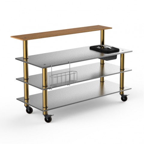 Mogogo Buffet Solutions Modular ProBar Station, 4-tier, 71" x 40" x 47-1/2"H, rectangular, solid stainless steel top, double wall ice bin, slick speed rail, (1) back shelf, high density bamboo finish, stainless steel, brushed brass casters, knocked do