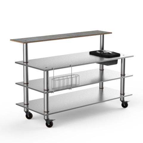 Mogogo Buffet Solutions Modular ProBar Station, 4-tier, 71" x 40" x 47-1/2"H, rectangular, solid stainless steel top, double wall ice bin, slick speed rail, (1) back shelf, grey slate BHP high pressure laminate with bamboo core top, stainless steel, b