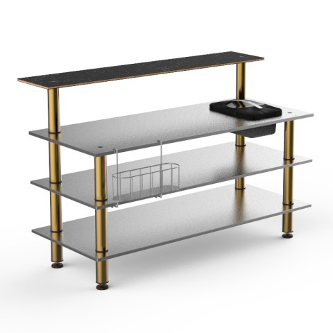 Mogogo Buffet Solutions Modular ProBar Station, 4-tier, 71" x 40" x 47-1/2"H, rectangular, solid stainless steel top, double wall ice bin, slick speed rail, (1) back shelf, Nero Marquina marble BHP high pressure laminate with bamboo core top, stainles