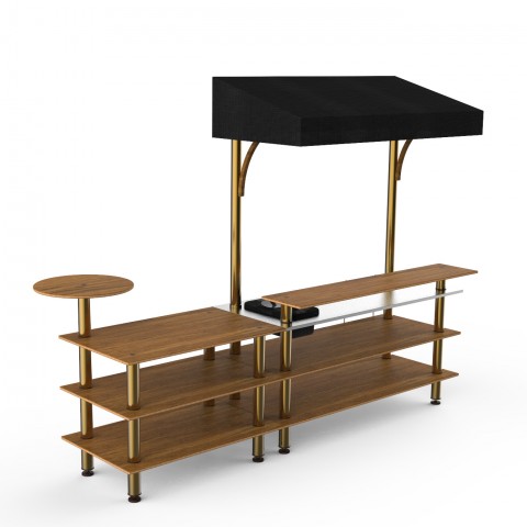 Mogogo Buffet Solutions Modular Mixology Bar Station, 3-tier, 125-1/2" x 41-1/2" x 96"H, rectangular, solid stainless steel work space, double wall ice bin, slick speed rail, (1) round side shelf, high density bamboo finish, black canopy, brushed brass le