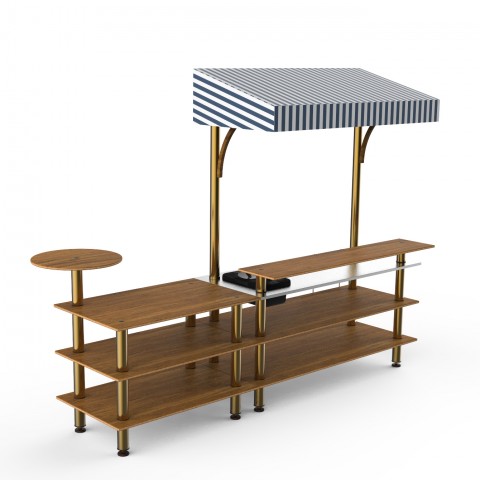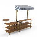 Mogogo Buffet Solutions Modular Mixology Bar Station, 3-tier, 125-1/2" x 41-1/2" x 96"H, rectangular, solid stainless steel work space, double wall ice bin, slick speed rail, (1) round side shelf, high density bamboo finish, white/blue canopy, brushed bra