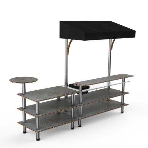 Mogogo Buffet Solutions Modular Mixology Bar Station, 3-tier, 125-1/2" x 41-1/2" x 96"H, rectangular, solid stainless steel work space, double wall ice bin, slick speed rail, (1) round side shelf, grey slate BHP high pressure laminate with bamboo core top
