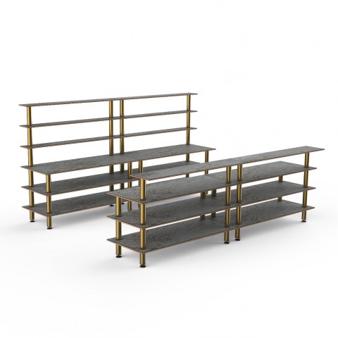 Mogogo Buffet Solutions Modular Double Bar, includes: (1) 142" x 29-1/2" x 73"H back bar & (1) 142" x 34-1/2" x 47-1/2"H front bar, grey slate BHP high pressure laminate with bamboo core top, brushed brass legs, knocked down