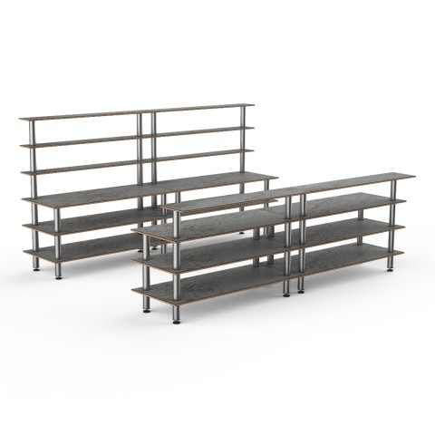 Mogogo Buffet Solutions Modular Double Bar, includes: (1) 142" x 29-1/2" x 73"H back bar & (1) 142" x 34-1/2" x 47-1/2"H front bar, grey slate BHP high pressure laminate with bamboo core top, brushed stainless steel legs, knocked down