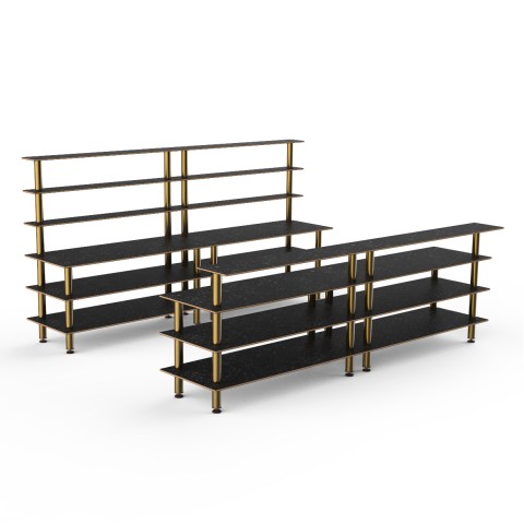 Mogogo Buffet Solutions Modular Double Bar, includes: (1) 142" x 29-1/2" x 73"H back bar & (1) 142" x 34-1/2" x 47-1/2"H front bar, Nero Marquina marble BHP high pressure laminate with bamboo core top, brushed brass legs, knocked down