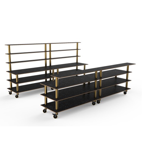 Mogogo Buffet Solutions Modular Double Bar, includes: (1) 142" x 29-1/2" x 73"H back bar & (1) 142" x 34-1/2" x 47-1/2"H front bar, Nero Marquina marble BHP high pressure laminate with bamboo core top, brushed brass casters, knocked down