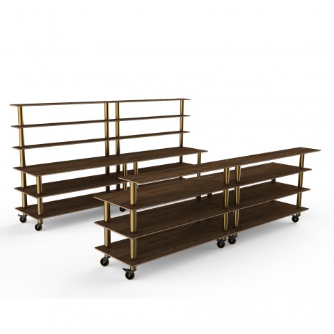 Mogogo Buffet Solutions Modular Double Bar, includes: (1) 142" x 29-1/2" x 73"H back bar & (1) 142" x 34-1/2" x 47-1/2"H front bar, Bengali mango wood BHP high pressure laminate with bamboo core top, brushed brass casters, knocked down
