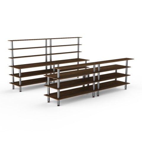 Mogogo Buffet Solutions Modular Double Bar, includes: (1) 142" x 29-1/2" x 73"H back bar & (1) 142" x 34-1/2" x 47-1/2"H front bar, Bengali mango wood BHP high pressure laminate with bamboo core top, brushed stainless steel legs, knocked down