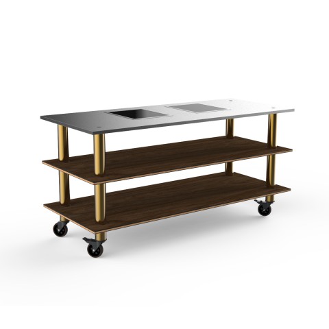 Mogogo Buffet Solutions Modular Pro Cooking Nemco Induction Station, 3-tier, drop-in, double well, 71" x 29-1/2" x 35"H, rectangular, cooking touch control, stainless steel work space, Bengali mango wood BHP high pressure laminate with bamboo core top, br