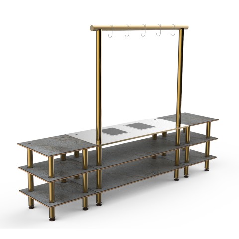 Mogogo Buffet Solutions Modular Nemco Induction Station, 3-tier, drop-in, double well, 130" x 29-1/2" x 96"H, rectangular, cooking touch control, with arch & (5) hooks, grey slate BHP high pressure laminate with bamboo core top, brushed brass legs, 1800 w