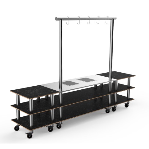 Mogogo Buffet Solutions Modular Nemco Induction Station, 3-tier, drop-in, double well, 130" x 29-1/2" x 96"H, rectangular, cooking touch control, with arch & (5) hooks, Nero Marquina marble BHP high pressure laminate with bamboo core top, brushed stainles
