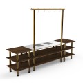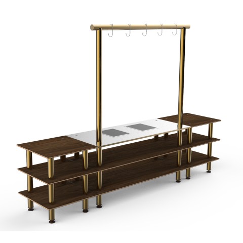 Mogogo Buffet Solutions Modular Nemco Induction Station, 3-tier, drop-in, double well, 130" x 29-1/2" x 96"H, rectangular, cooking touch control, with arch & (5) hooks, Bengali mango wood BHP high pressure laminate with bamboo core top, brushed brass legs