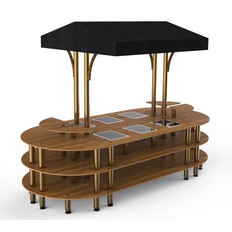 Mogogo Buffet Solutions Modular Warming Nemco Induction Market Station, 3-tier, drop-in, 6 well, 130" x 59" x 96"H, rounded, touch control, (4) triangular shelves, high density bamboo finish, black canopy, brushed brass legs, 270 watt, 120v, 2.2 amps, kno