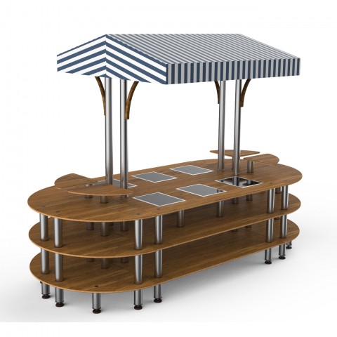 Mogogo Buffet Solutions Modular Warming Nemco Induction Market Station, 3-tier, drop-in, 6 well, 130" x 59" x 96"H, rounded, touch control, (4) triangular shelves, high density bamboo finish, white/blue canopy, brushed stainless steel legs, 270 watt, 120v