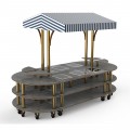 Mogogo Buffet Solutions Modular Warming Nemco Induction Market Station, 3-tier, drop-in, 6 well, 130" x 59" x 96"H, rounded, touch control, (4) triangular shelves, grey slate BHP high pressure laminate with bamboo core top, white/blue canopy, brushed bras