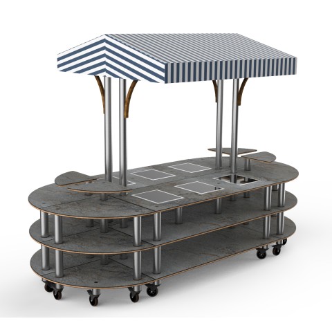 Mogogo Buffet Solutions Modular Warming Nemco Induction Market Station, 3-tier, drop-in, 6 well, 130" x 59" x 96"H, rounded, touch control, (4) triangular shelves, grey slate BHP high pressure laminate with bamboo core top, white/blue canopy, brushed stai