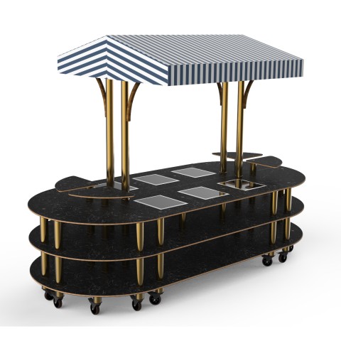 Mogogo Buffet Solutions Modular Warming Nemco Induction Market Station, 3-tier, drop-in, 6 well, 130" x 59" x 96"H, rounded, touch control, (4) triangular shelves, Nero Marquina marble BHP high pressure laminate with bamboo core top, white/blue canopy, br