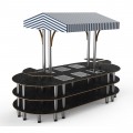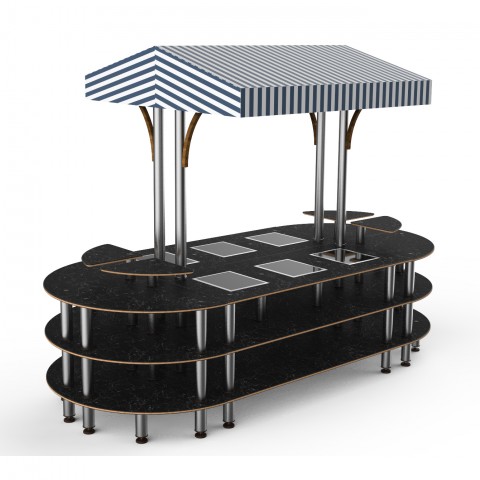 Mogogo Buffet Solutions Modular Warming Nemco Induction Market Station, 3-tier, drop-in, 6 well, 130" x 59" x 96"H, rounded, touch control, (4) triangular shelves, Nero Marquina marble BHP high pressure laminate with bamboo core top, white/blue canopy, br