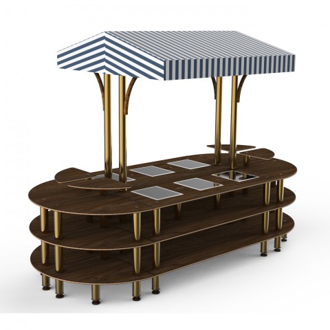 Mogogo Buffet Solutions Modular Warming Nemco Induction Market Station, 3-tier, drop-in, 6 well, 130" x 59" x 96"H, rounded, touch control, (4) triangular shelves, Bengali mango wood BHP high pressure laminate with bamboo core top, white/blue canopy, brus
